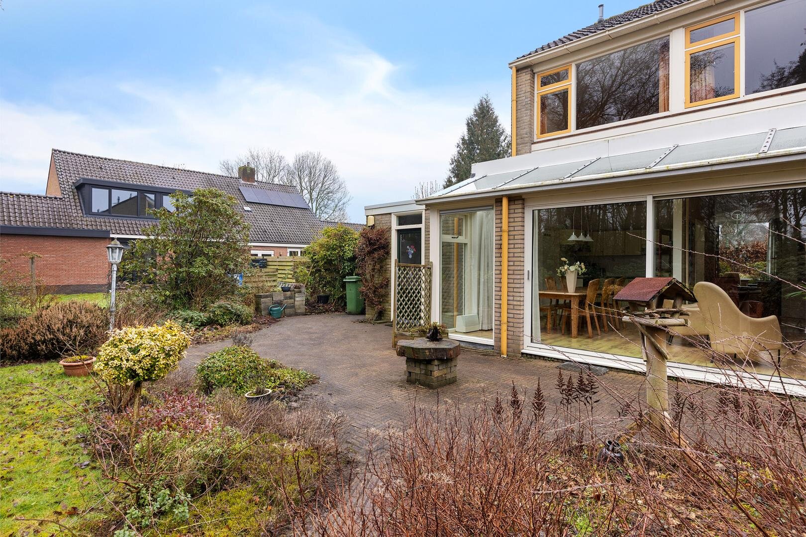 De woning beschikt aan de achterzijde over een aangebouwde serre waardoor er ook bij minder weer comfortabel buiten gezeten kan worden. De achtertuin is diep en biedt vrij uitzicht over de landerijen, wat zorgt voor rust en een open gevoel.