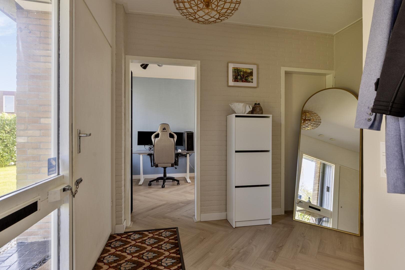 Entree/hal met meterkast en toilet. Vanuit de hal is er toegang tot een ruime kamer van circa 16 m², momenteel in gebruik als kantoor. Deze ruimte beschikt over twee toegangen en is eenvoudig op te splitsen in twee (slaap)kamers.