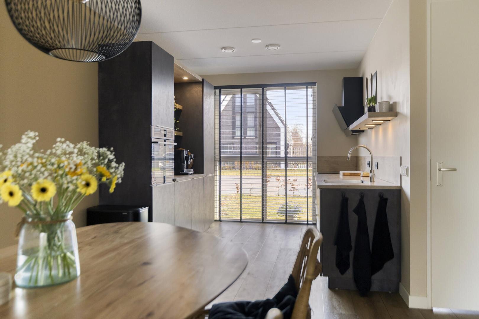 De living van circa 40 m² is een prettige leefruimte met voldoende plaats voor een comfortabele zithoek en een eethoek. De ruimte vormt het hart van de woning en staat in open verbinding met de keuken. De keurige keuken heeft een natuurstenen werkblad, biedt voldoende werk- en kastruimte en is voorzien van 5-pits gaskookplaat, afzuigkap, oven en koelkast. Vanuit de keuken geeft de schuifpui direct toegang tot de tuin.