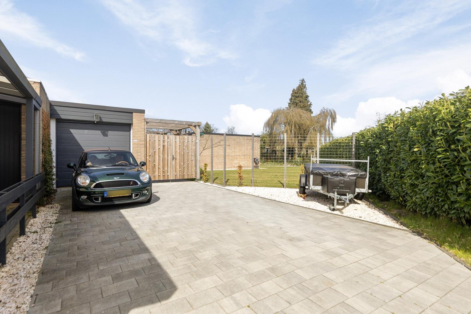 Aangebouwde garage van circa 29 m² en een berging. De oprit biedt ruimte voor meerdere auto’s op eigen terrein.