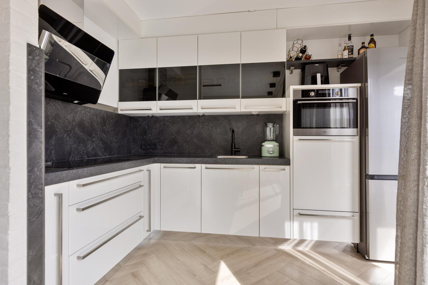 De woonkamer is bereikbaar vanuit de hal en vormt het centrale punt van de woning. De ruimte is ruim opgezet en beschikt over een mooie raampartij met zicht op de tuin, wat zorgt voor een prettige verbinding met buiten. De woonkamer is praktisch in te delen met een zit- en eetgedeelte en is voorzien van een visgraatvloer. De keuken (2015) sluit hierop aan en is voorzien van een vaatwasser, combi-oven, inductiekookplaat en afzuigkap. Vanuit de keuken is de bijkeuken bereikbaar.