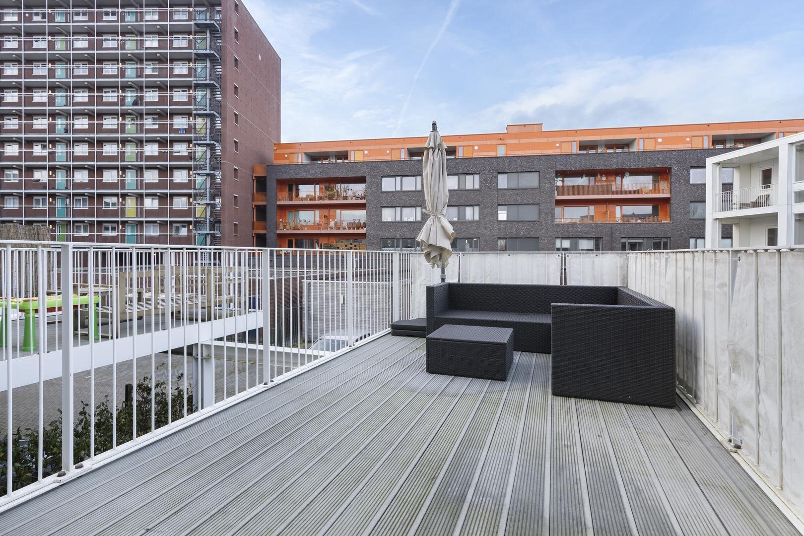 Het ruime dakterras is goed onderhouden en gelegen op het westen, waardoor je al begin van de middag tot in de avond kunt genieten van de zon. Vanuit de bijkeuken heb je toegang tot de twee privé parkeerplaatsen en het gezamenlijke binnenterrein met een groot grasveld.