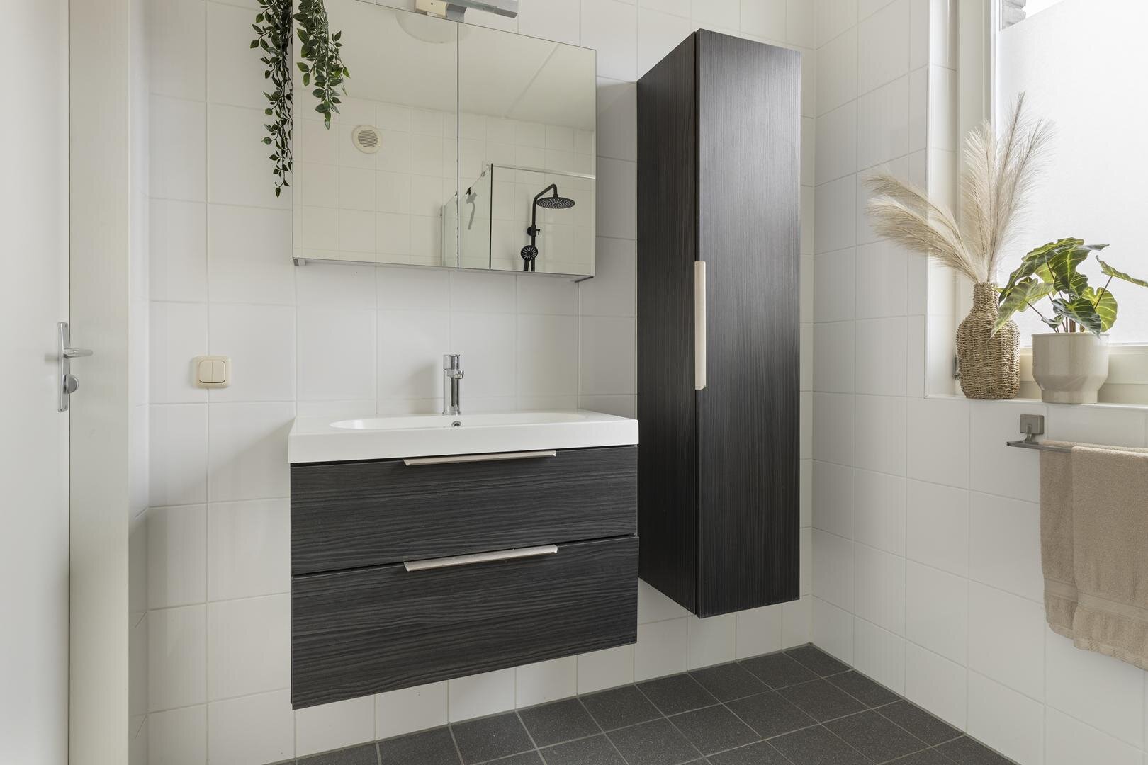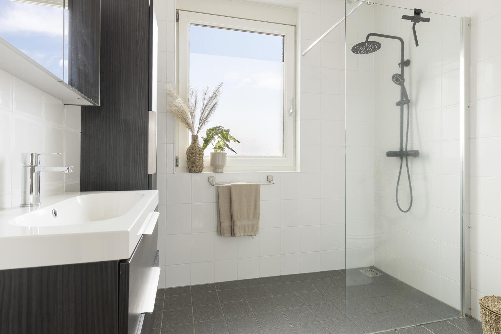 Tweede verdieping: overloop, drie slaapkamers van respectievelijk ca. 9, 8 en 7 m², nette badkamer van ca. 5 m² met inloopdouche, wastafelmeubel en toilet.