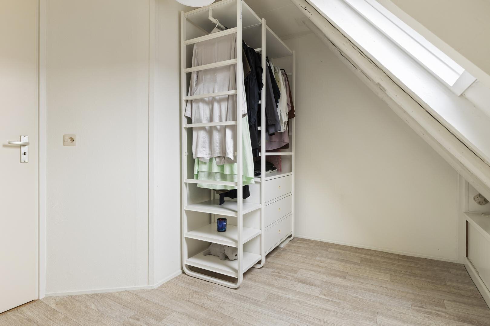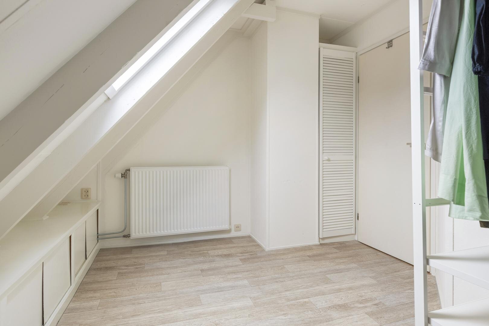 Eerste verdieping: ruime overloop met wasmachineaansluiting, bergruimte, cv-opstelling en vaste kast, twee slaapkamers van ca. 10 en 6 m², badkamer met douche en wastafelmeubel.