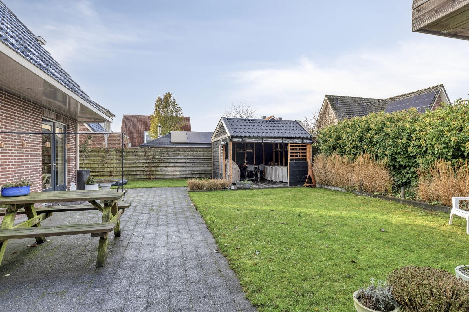 Er is een houten tuinberging met aangrenzende overkapping (ca. 4 x 4 m) die in voor- en najaar afsluitbaar is — perfect voor lange avonden buiten. Aan de andere zijde van de tuin is in 2024 een sfeervolle “grill-lounge” gerealiseerd: een fantastische plek voor de grillmasters onder ons!