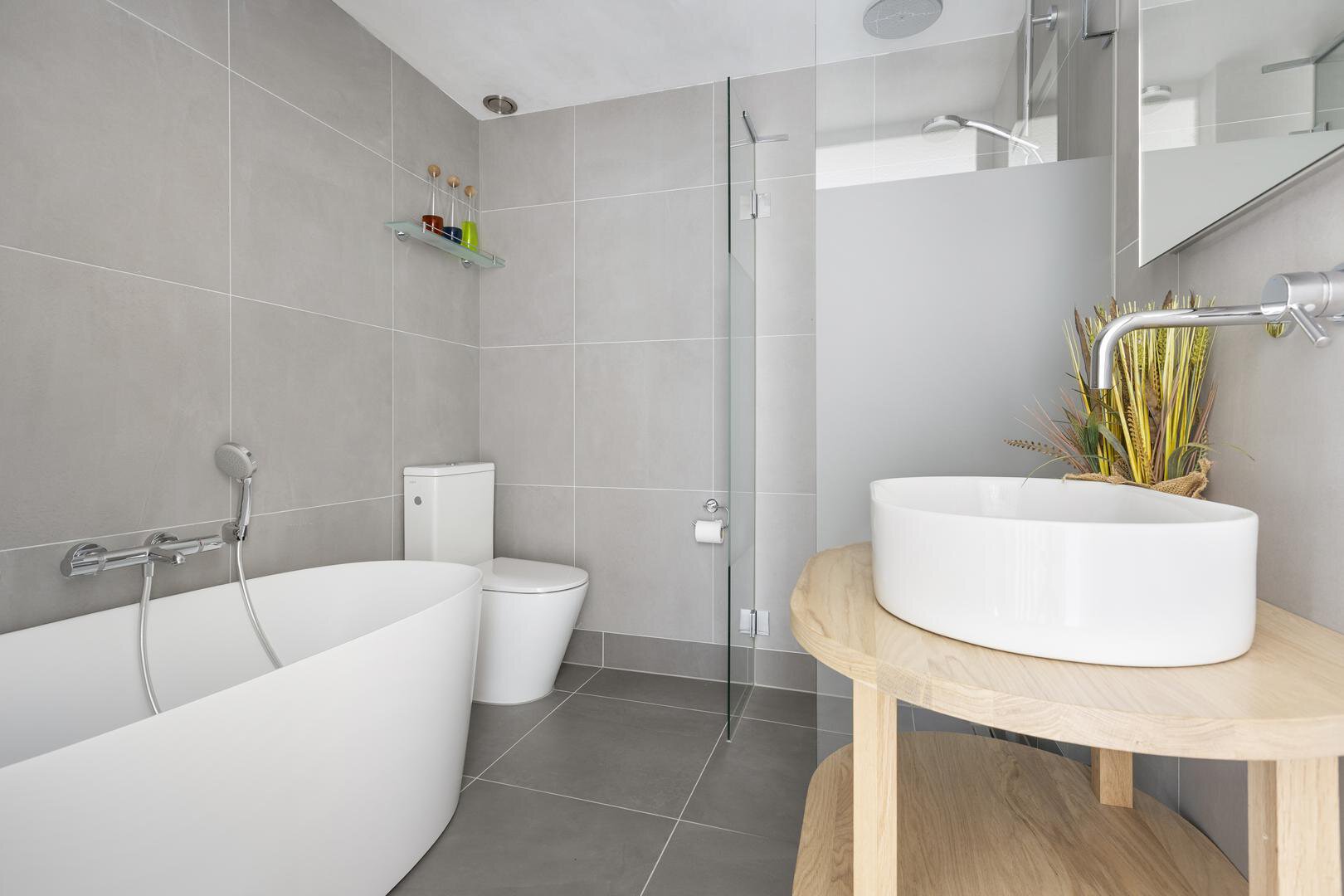 Eerste verdieping: overloop, drie slaapkamers van ca. 17, 9 en 6 m², moderne badkamer (2024) van ca. 5 m² met ligbad, inloopdouche, wastafelmeubel en tweede toilet.